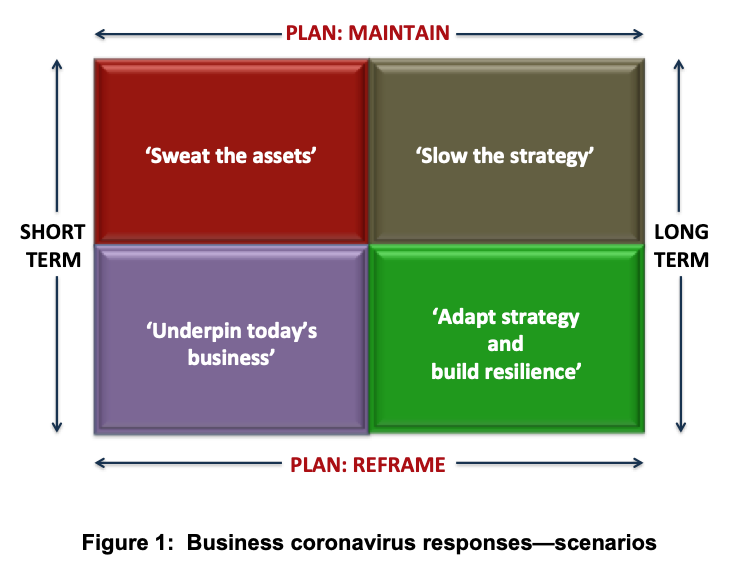 What do we expect businesses to do? In this crisis more organisations were taking emergency measures (sweating the assets). We anticipate them, if successful, to then take further action to ‘underpin today’s’ business’ in the economic recovery period. We expect these initial mid-2020 positions to evolve. If the crisis was prolonged, and just as in the 2008-2009 downturn, organisations in the ‘slow the strategy’ mode will increasingly move to securing today’s performance. Those adapting strategy and building resilience would already have the capacity to look after current business health, while planning and building for the long-term. Certainly, the businesses that come out of the crisis better are likely to be those who feel more capable of having long-term plans. But there might be some over-confidence here. An April 2020 McKinsey executive survey found 59 percent choosing ‘optimistic’ scenarios, with the most popular being where public health response is effective, but the virus recurs and economic policy interventions are only partially effective. This assumes a staggered, U-shaped recovery. This was a likely scenario, but as we know from forecasting generally, there can be no guarantees. Could one assume, safely, that no further crises would hit during 2020–2021? The evidence by August 2020 suggested otherwise. Perhaps an even more staggered, perhaps W-shaped, or even staggered W-shaped, recovery will occur, and how prepared would businesses be for that?