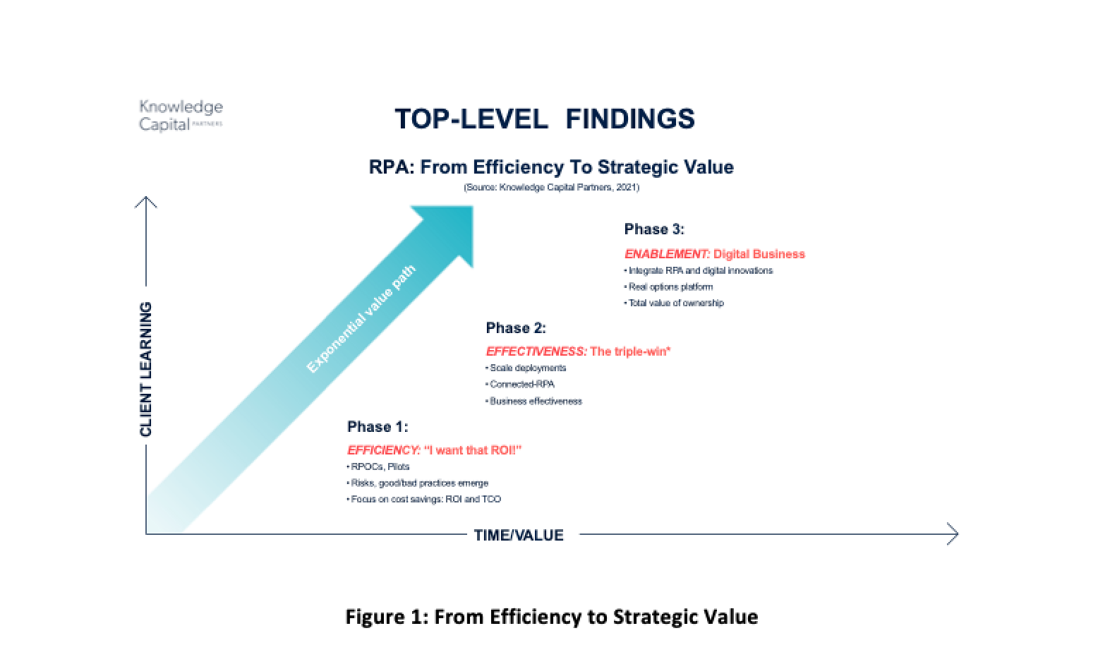 - 4. See Figure 1. The typical organisation gets caught in Phase 1. Initial outlays are small. Frequently the efficiency returns are good, but further investment looks expensive, and the benefits look less clear. With some vendor products enterprise RPA is harder to achieve technologically, and maintenance and support is costly. Looking at traditional ROI-based business cases, senior management under-invest, still seeing RPA—and indeed intelligent automation—as tactical tools. Digital transformation efforts maybe ongoing but do not connect up, being driven from a different place, with different budgets, and usually under-written from higher up in the organisation.