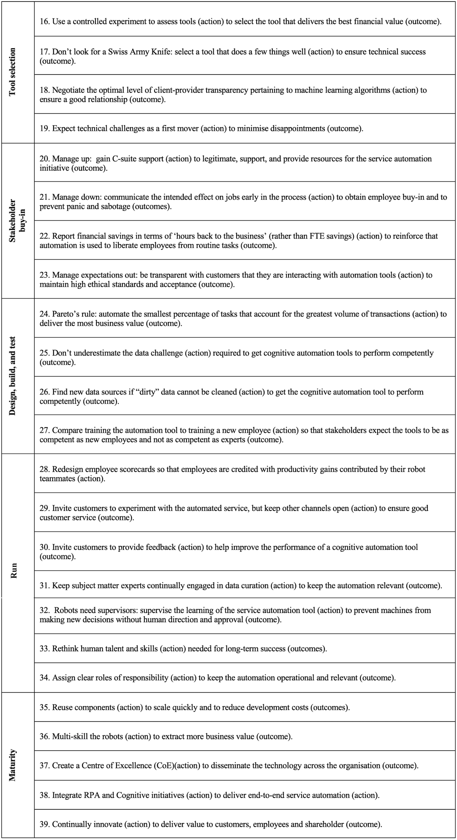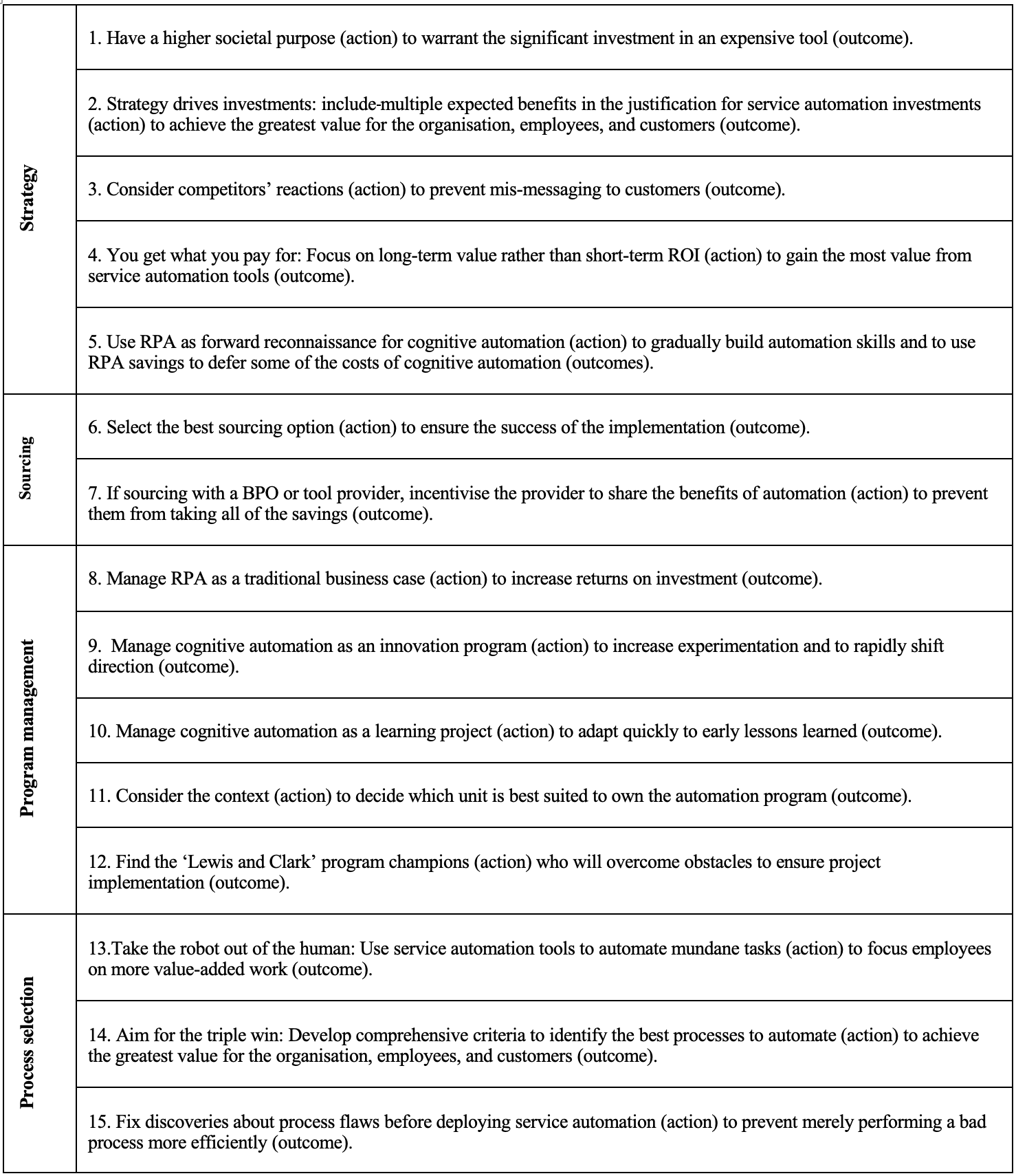 Mary Lacity: As far as progressing an RPA/CA journey, we have done now, by mid 2022, some eight years research on this and our summary is shown below. Action principles are practices identified by our research that produced desirable results in real world automation implementations. Action principles are grounded in data and are designed to assist other thoughtful agents as they embark on their own implementation journeys. Action principles are similar to best practices in that both seek to share knowledge from prior experiences. But whereas ‘best practices’ imply that mimicry is always recommended and will always produce similar results, action principles recognise that context matters. The usefulness of a practice depends on the objectives the organisation is trying to achieve, whether the organisation has the absorptive capacity to implement the practice effectively; and timing—there are better times than others to apply a specific practice. We leave it to the thoughtful managers to assess the applicability of the action principles to their contexts.