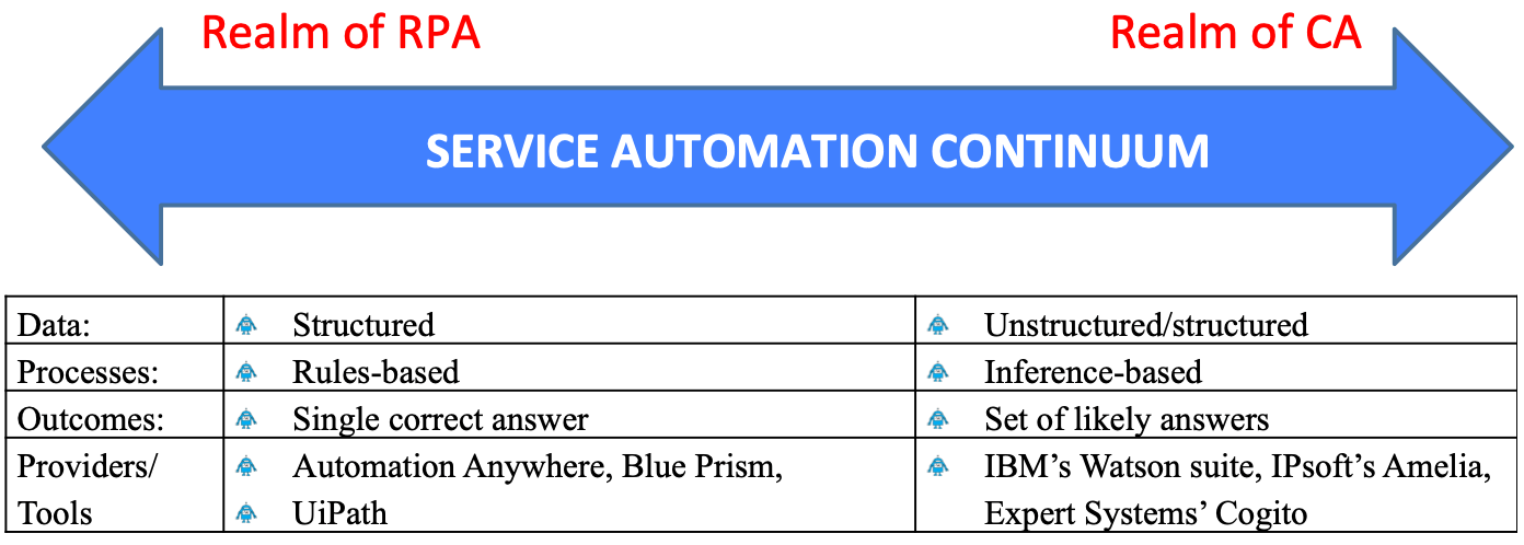 We asked a very straightforward question to make sense of the proliferation of service automation jargon: What types of tasks are the tools designed to automate or augment? Looking at the data, process, and outcomes, we conceived of service automation comprising a continuum (see Figure 1). Anchored on one side is the realm of RPA; the other, Cognitive Automation (CA). (We do not call CA technologies ‘Artificial Intelligence’ because the ‘AI’ label aggrandises what these tools, do in our opinion—I have discussed this in previous blogs.