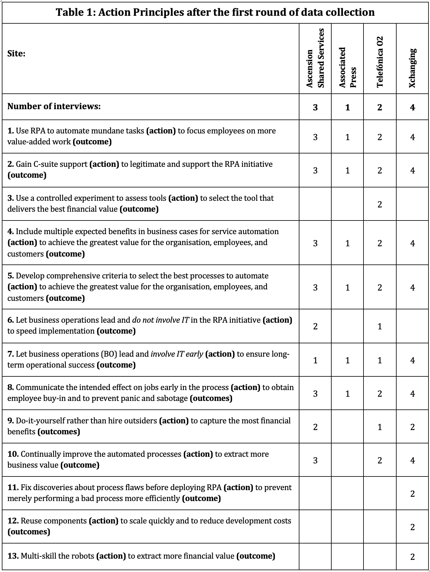 We had reached an interesting stage in the research. There had been many surprises. Many myths found in the popular literature had been contradicted. Managers were not automating to cut headcount but because they had labour shortages, productivity problems, and were dealing with ever rising workloads. Most employees did not resist the technology; many embraced it as an opportunity—for example, to get rid of low grade tasks, to gain new skills, to be involved in innovation, or to get more work done. RPA was not being used particularly to bring back previously offshored jobs. Not all tools called RPA were the same. Not all processes could be automated effectively. RPA did NOT mean that a business manager could automate without reference to the IT department and IT specialists. There were many other discoveries. And by this point we also had a good 13 principles we could recommend to practitioners.