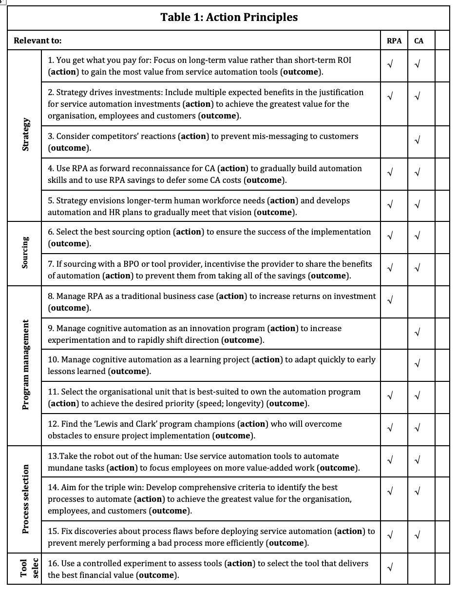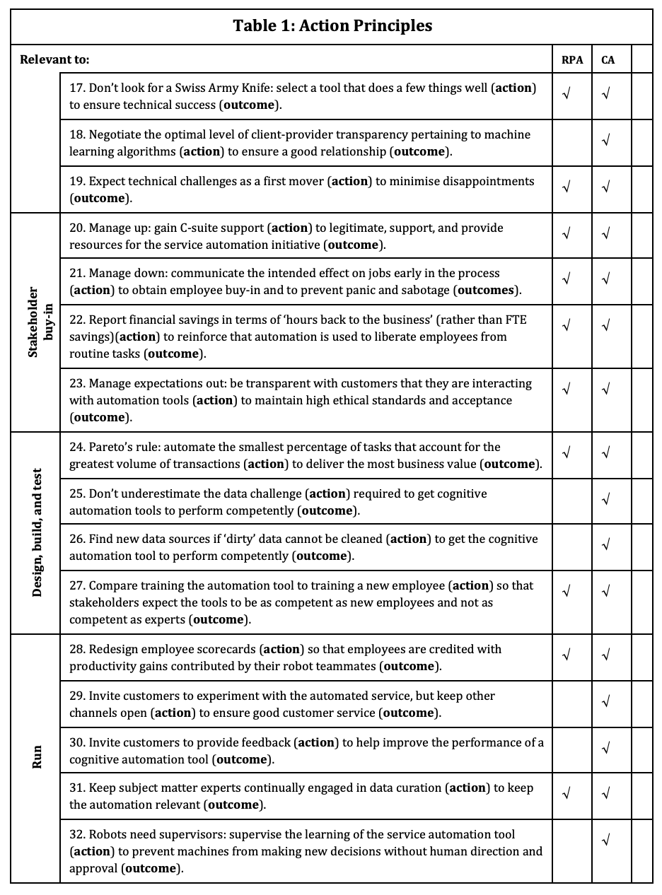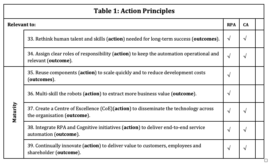 It is useful to point out how action principles evolve with more data collection. For example, we initially identified the action principle ‘Let business operations (BO) lead’. After looking at more cases, that action principle was changed to ‘Let business operations (BO) lead, but bring in IT early’. With the next round of data, four new client adoption journeys (IBM, VHA, a financial services firm and an insurance company) had been successfully led by IT. Two of the IT-led cases were automating IT processes (help desk ticketing), not BO processes, which makes sense for IT to lead. As another example, one detailed survey did not find a statistically significant relationship between the RPA champion (IT, BO, or other) and business outcomes. Our books discuss the nuances and trade-offs of each approach (see the www.roboticandcognitiveautomation.com website), while our Journal of Information Technology article provides a more mature and definitive version of our methods, terminology and results (Lacity, Willcocks and Gozman, 2021). Now have a read through the action principles in Table 1. before I comment further on them.