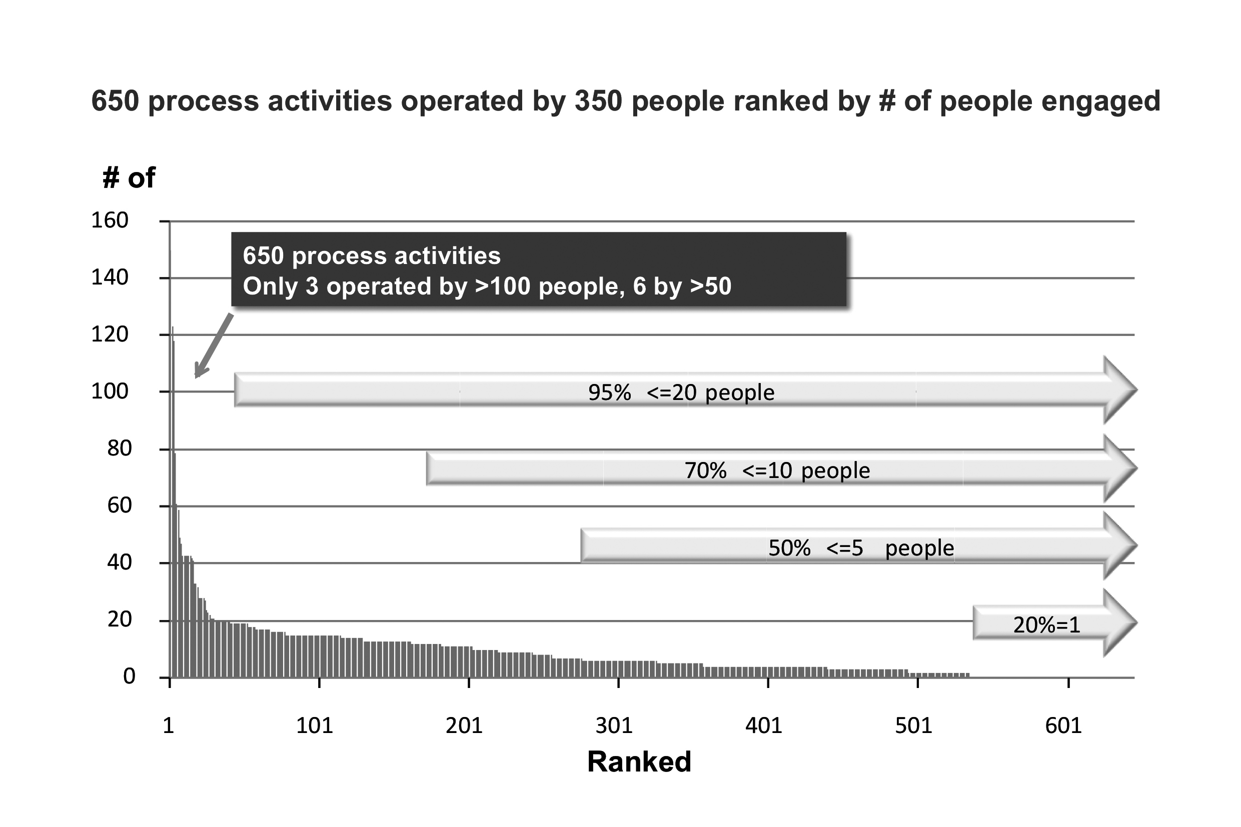 Business Solutions was at the wrong end of the scale of attractiveness, dealing with very low volumes, low standardisation, lots of regulation, very fragmented systems and with almost no outsourcing. Process complexity was considerable (see Figure 1). BS was undertaking 650 different processes, each made up of many activities. How could BS exploit robotic opportunities in such a low volume, highly complex environment?
