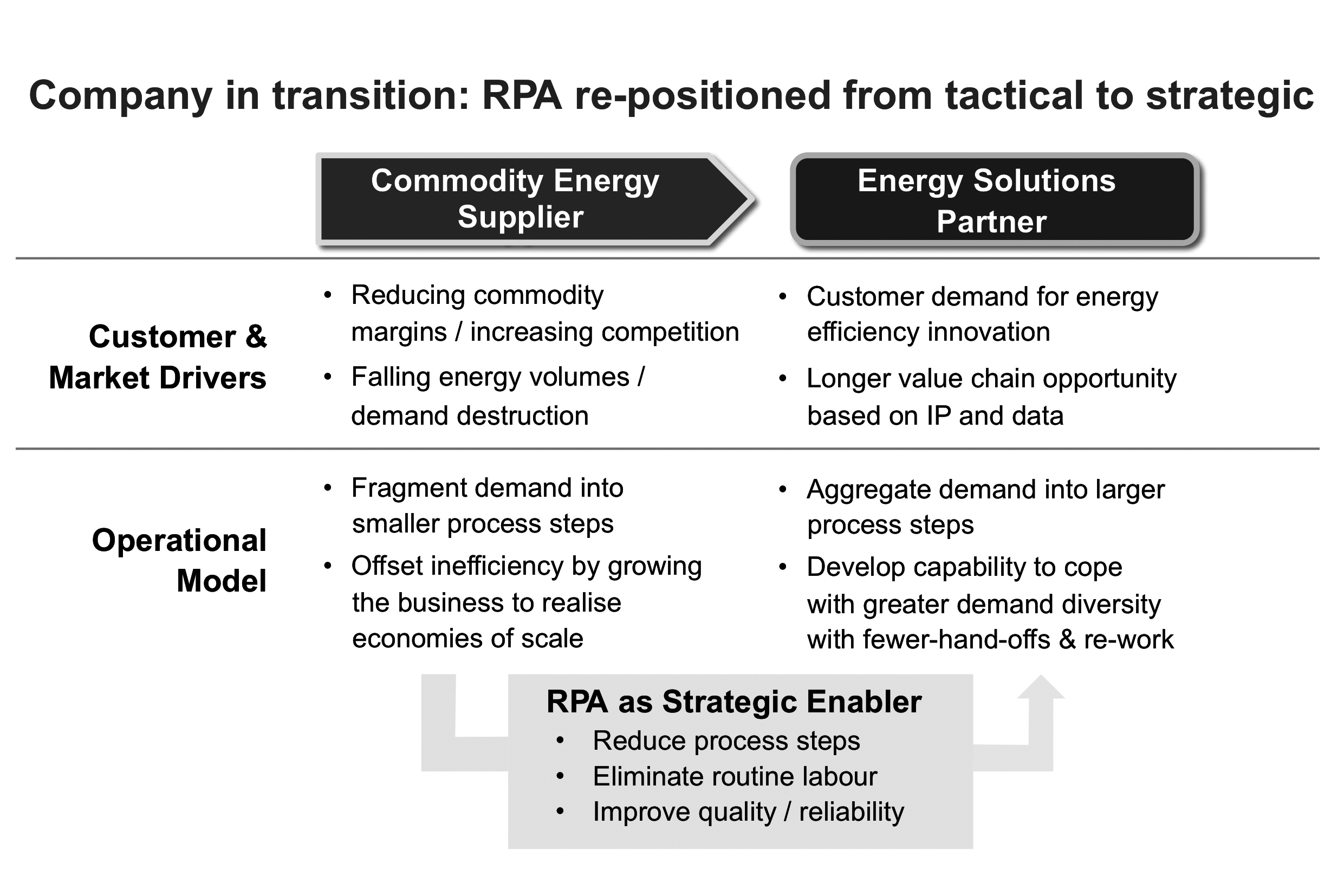 In mid-2014 the drivers for using RPA were as much about flexibility and agility, and not just costs in what was becoming a fast changing, competitive market, with the need to respond rapidly to regulatory requirements and to dynamic customer requirements in the marketplace.