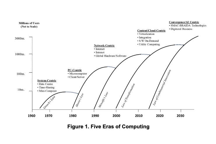 1. First, an era marks out the start-up and growth to mass use of information-based technologies. Technological deployment in an era may rise and decline, but in practice, much continues and is built upon during the next phase. Mainframes and PCs, for example, are still massively used today. The Internet and World Wide Web took off in the 1990s and have not stopped growing exponential. The Cloud infrastructure of 2025 was put in place over 30 years. The technologies coming on stream from the 2020s will become increasingly embedded.