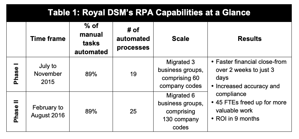 Phase I - from July 2015 - aimed to automate financial close for three business groups. DSM created an RPA project team that comprised FSS and Redwood employees. Much of the initial work focused on documenting tasks performed by humans in enough detail to be specified as rules for the software.
